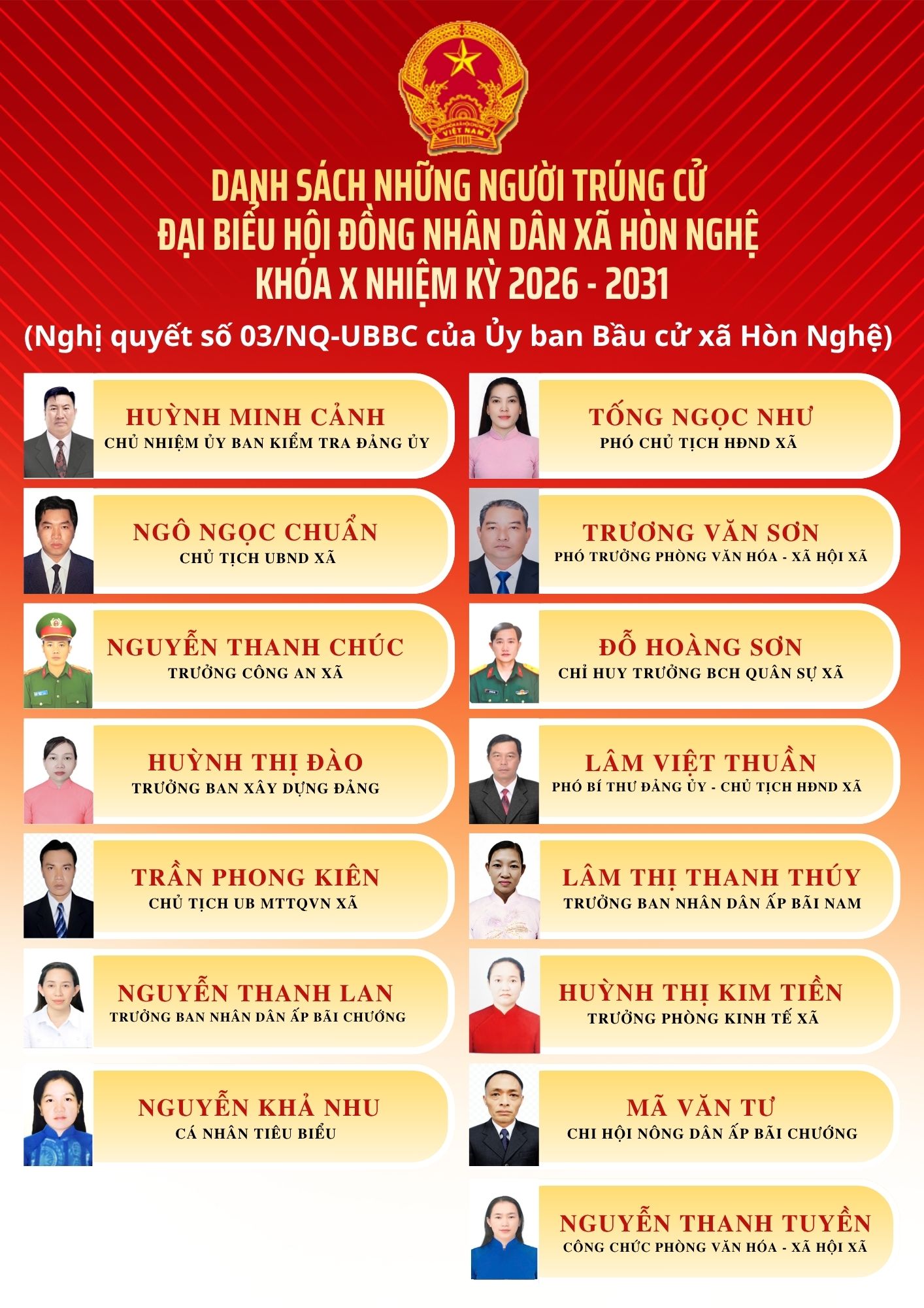 Ủy ban bầu cử xã Hòn Nghệ đã công bố kết quả bầu cử và danh sách những người trúng cử đại biểu HĐND xã Hòn Nghệ khóa X nhiệm kỳ 2026-2031. Trang thông tin điện tử xã Hòn Nghệ xin trân trọng giới thiệu danh sách chi tiết.