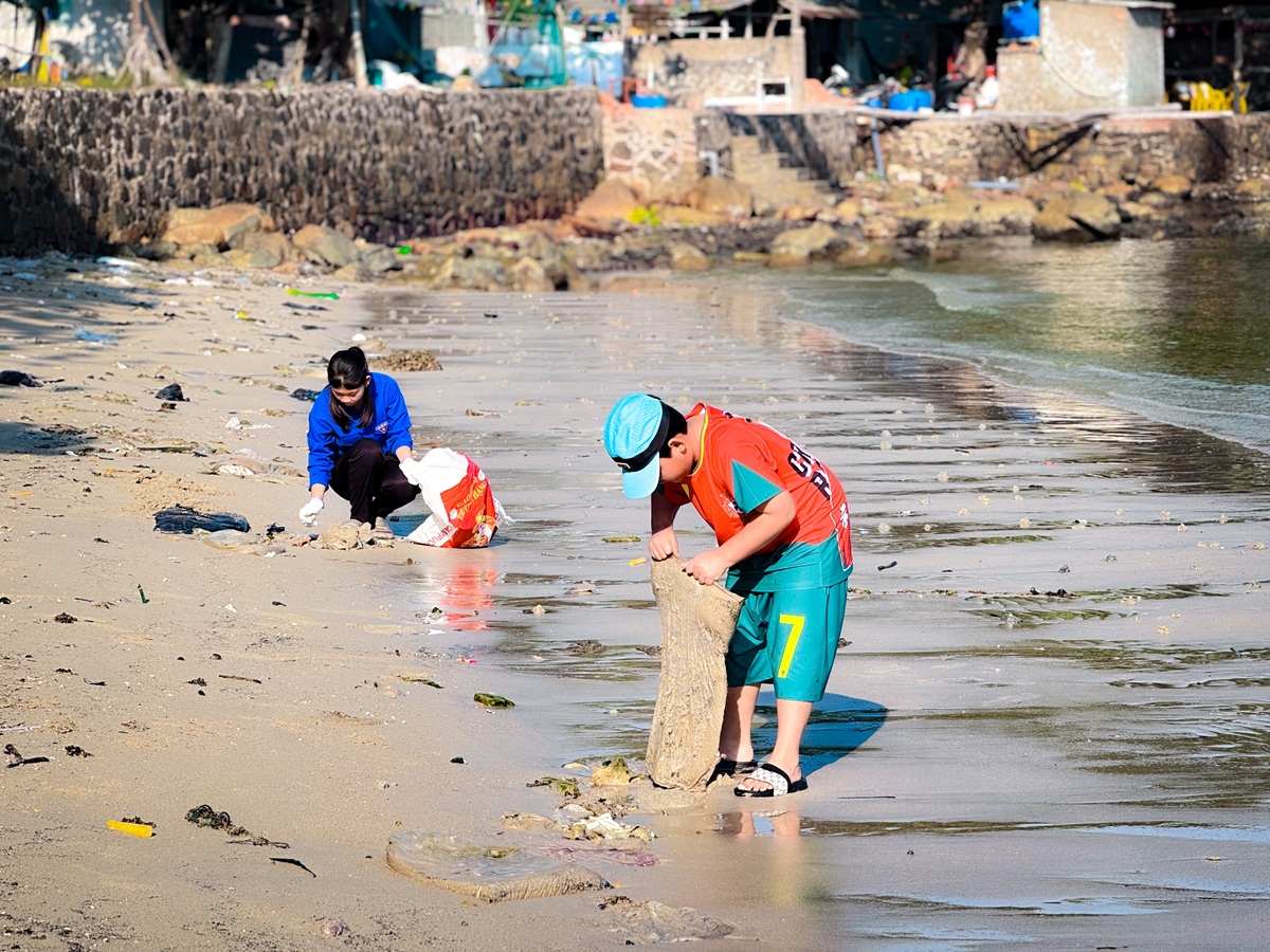 Đoàn viên thanh niên và Nhân dân tham gia thu gom rác thải tại khu vực bãi biển trước chùa Liên Tôn Cổ Tự.