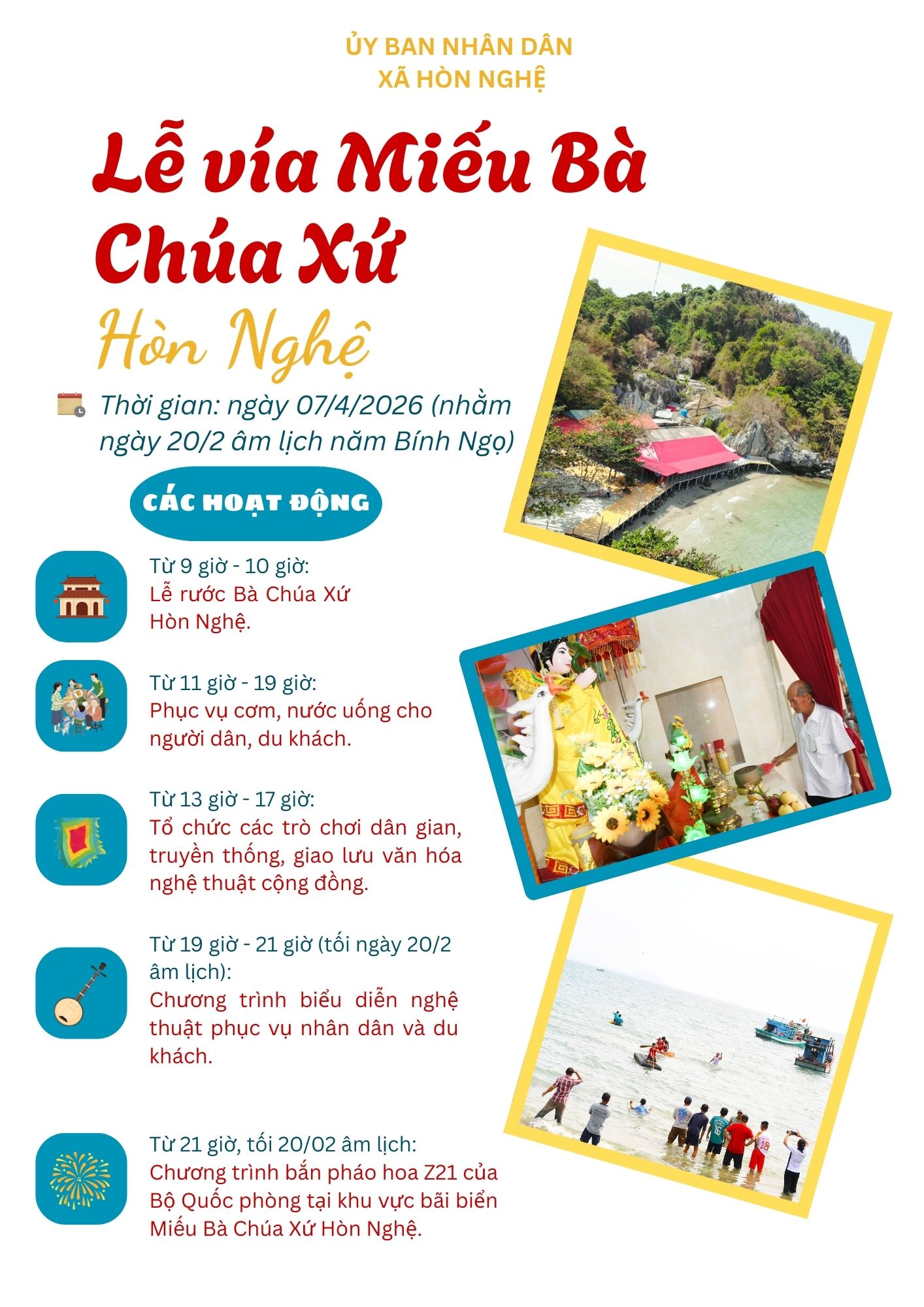 Lễ vía Miếu Bà Chúa Xứ Hòn Nghệ năm 2026 sẽ diễn ra vào ngày 07/4/2026 (nhằm ngày 20/2 âm lịch) với nhiều hoạt động phong phú, đặc sắc, góp phần giữ gìn và phát huy giá trị văn hóa truyền thống của địa phương. Chương trình gồm lễ rước Bà trang nghiêm, phục vụ ẩm thực miễn phí cho người dân và du khách, các trò chơi dân gian, giao lưu văn hóa cộng đồng và chương trình biểu diễn nghệ thuật đặc sắc, bắn pháo hoa Z21 của Bộ Quốc phòng, hứa hẹn mang đến không khí vui tươi, phấn khởi, thu hút đông đảo người dân và du khách tham gia.
