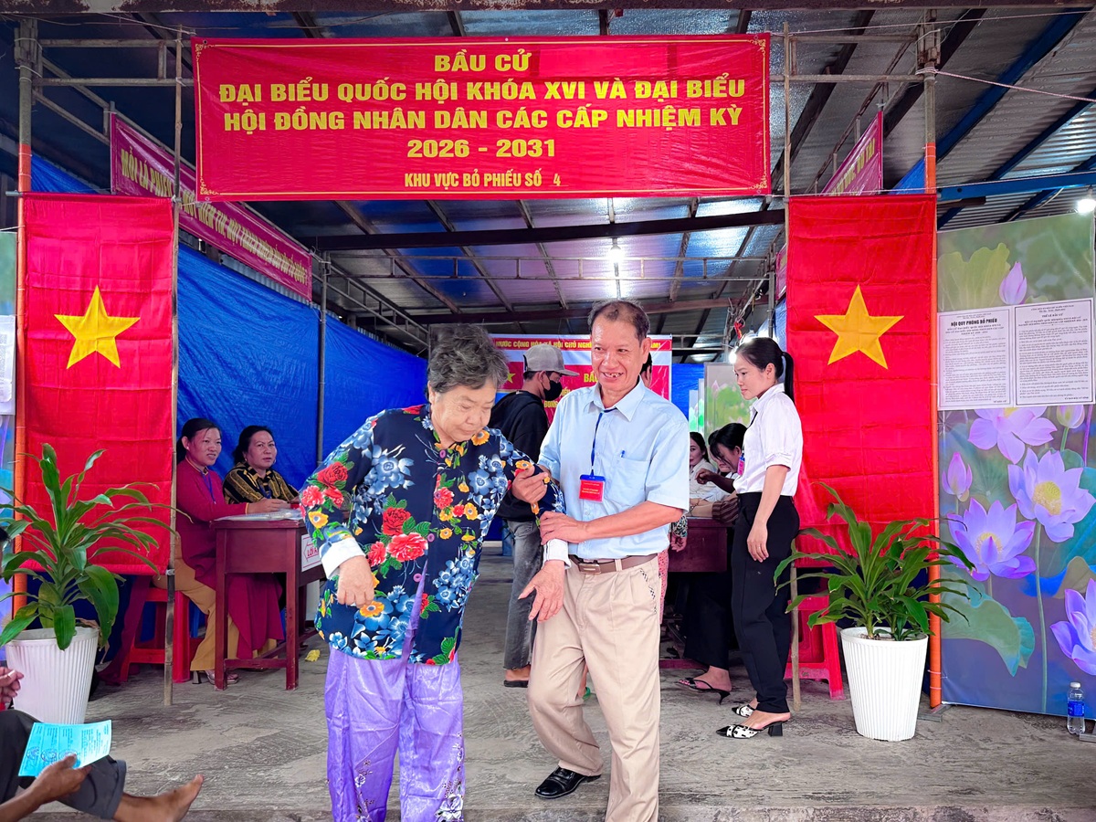 Thành viên các Tổ bầu cử tích cực hỗ trợ các cử tri lớn tuổi khi đến bỏ phiếu (hình ảnh ghi nhận tại khu vực bỏ phiếu số 4)