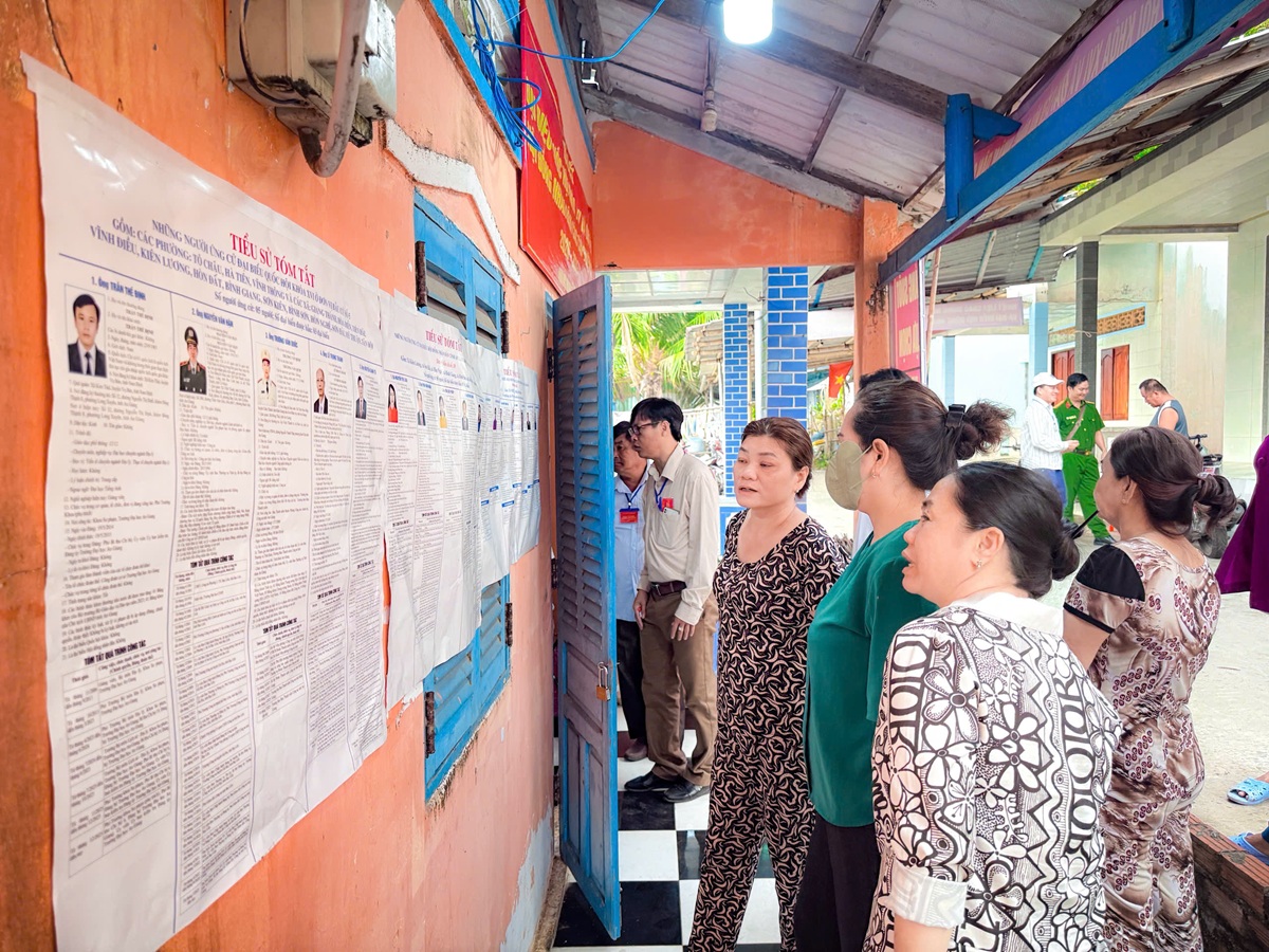 Cử tri Khu vực bỏ phiếu số 1 xem tóm tắt tiểu sử các ứng cử viên để lựa chọn những người xứng đáng đại diện cho ý chí, nguyện vọng của Nhân dân
