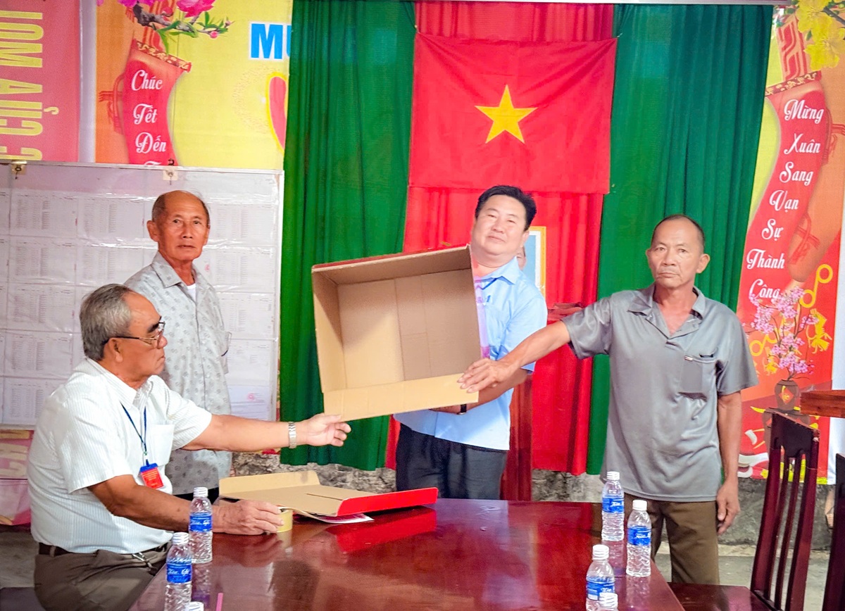 Đại diện cử tri tiêu biểu tiến hành thủ tục kiểm tra thùng phiếu (hình ảnh ghi nhận tại Khu vực bỏ phiếu số 1)