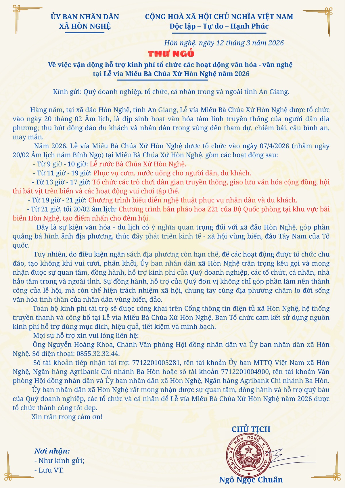 Ngày 12-3, Ủy ban nhân dân xã Hòn Nghệ ban hành thư ngỏ vận động hỗ trợ kinh phí tổ chức các hoạt động văn hóa - văn nghệ tại Lễ vía Miếu Bà Chúa Xứ Hòn Nghệ năm 2026 gửi các quý doanh nghiệp, các tổ chức, cá nhân, trong và ngoài tỉnh An Giang.