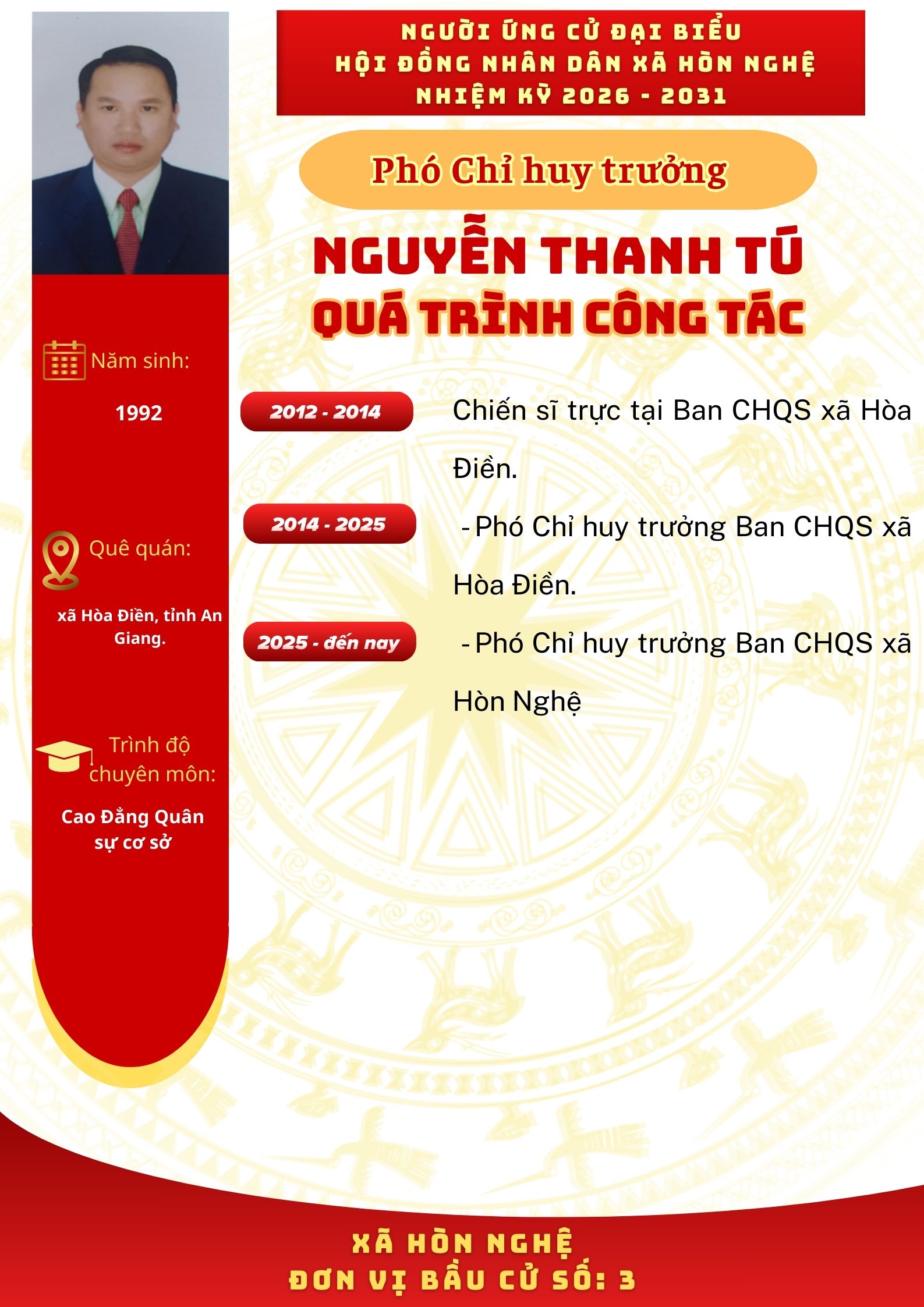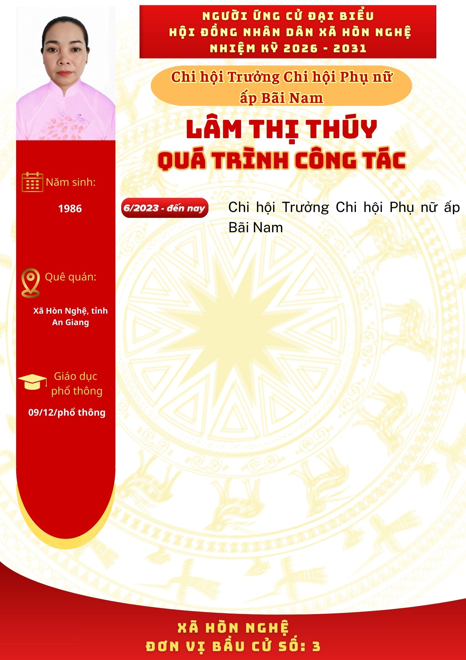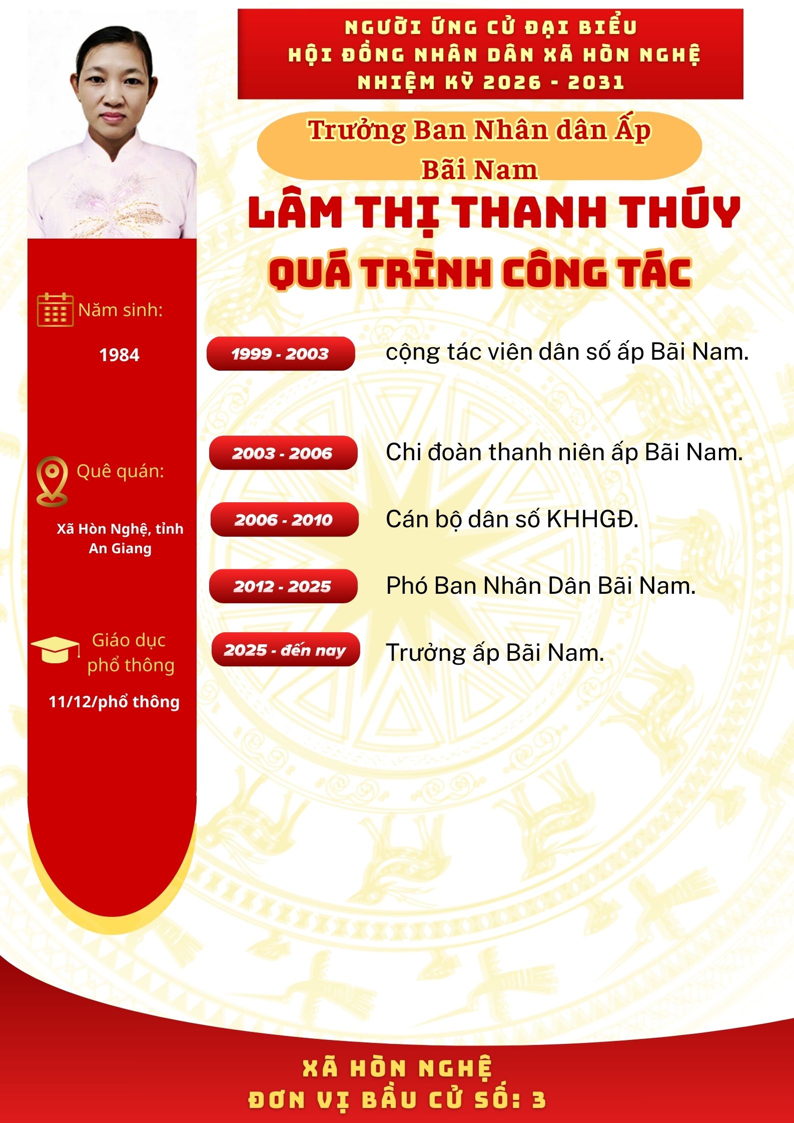 Sau đây là tiểu sử tóm tắt của những người ứng cử tại Đơn vị bầu cử số 3 (gồm: Tổ NDTQ số 04, 05, 06, ấp Bãi Nam; tổng số người ứng cử: 5 người; số đại biểu Hội đồng nhân dân xã Hòn Nghệ được bầu: 3 đại biểu).