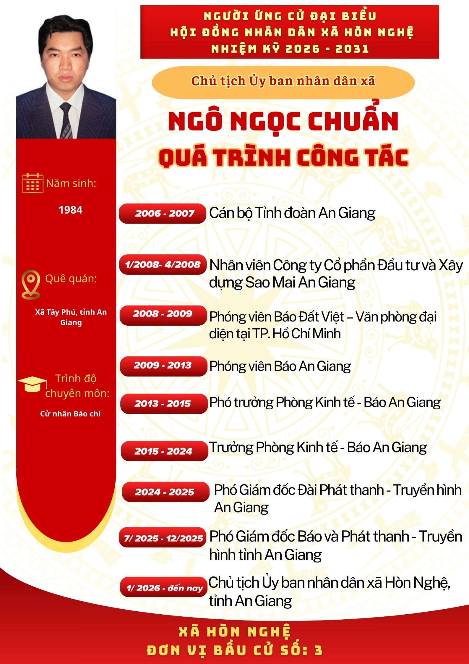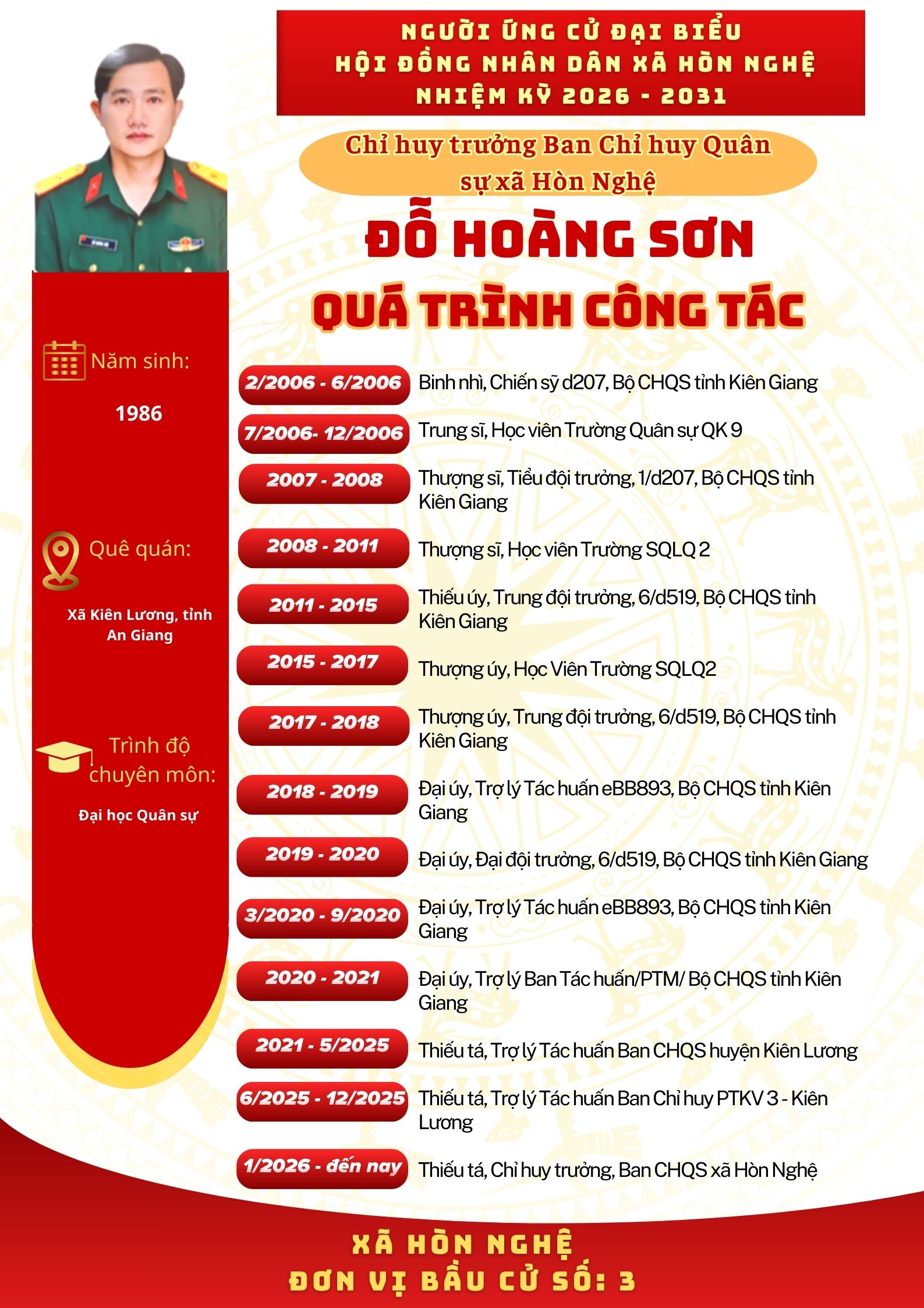 Ngày 13/2, Uỷ ban Bầu cử xã Hòn Nghệ đã ban hành Nghị quyết công bố danh sách chính thức 26 người ứng cử đại biểu HĐND xã Hòn Nghệ nhiệm kỳ 2026-2031 tại 4 đơn vị bầu cử. Trang thông tin điện tử xã Hòn Nghệ trân trọng giới thiệu tiểu sử tóm tắt của người ứng cử theo từng đơn vị bầu cử để cử tri được biết, lựa chọn những người xứng đáng bầu chọn vào HĐND xã.