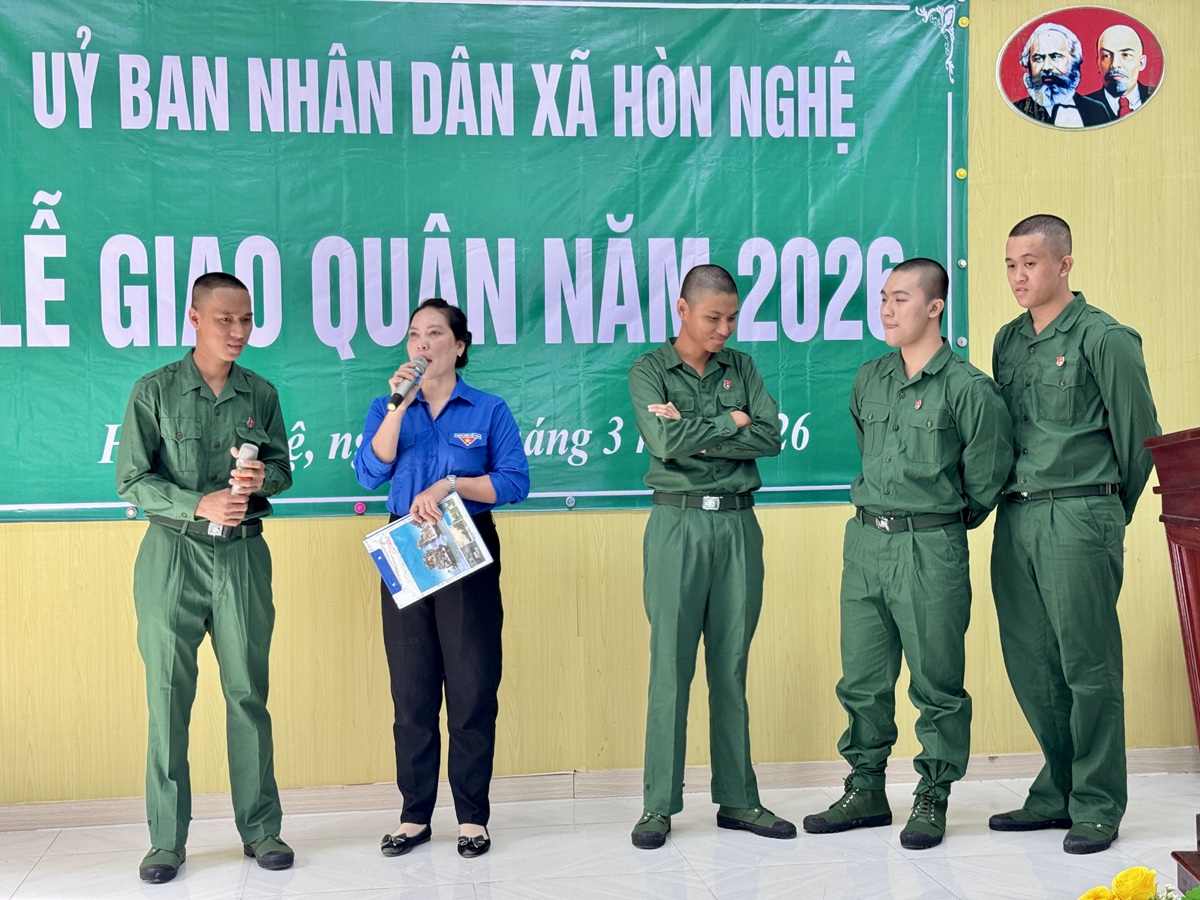 Năm 2026, xã Hòn Nghệ được giao chỉ tiêu 4 công dân nhập ngũ (trong đó: 4 chỉ tiêu quân sự và không có chỉ tiêu công an). Đây là những gương mặt trẻ tiêu biểu có phẩm chất chính trị vững vàng, sức khỏe tốt, luôn sẵn sàng nhận và hoàn thành mọi nhiệm vụ được giao. Tin rằng với truyền thống cách mạng, tinh thần xung kích và ý chí rèn luyện, tuổi trẻ Hòn Nghệ sẽ vững bước trong môi trường quân đội, hoàn thành xuất sắc nhiệm vụ được giao, góp phần tô thắm thêm truyền thống anh hùng của lực lượng vũ trang và quê hương./.